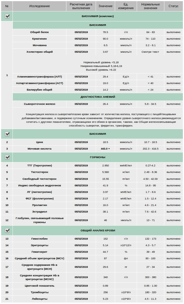 Анализы в конце 2-й недели (~14 день 14ч. после инъекции): Тестостерон общий, Эстрадиол, Пролактин, АЛТ, АСТ, Билирубин, ОАК.