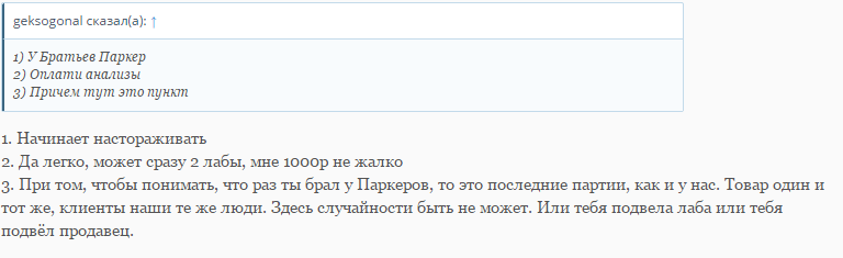 и нахера к этому тогда писать 1 пункт??? тоже непонятно....3. При том, чтобы понимать, что раз ты брал у Паркеров, то это последние партии, как и у нас. Товар один и тот же, клиенты наши те же люди. Здесь случайности быть не может. Или тебя подвела лаба или тебя подвёл продавец.
